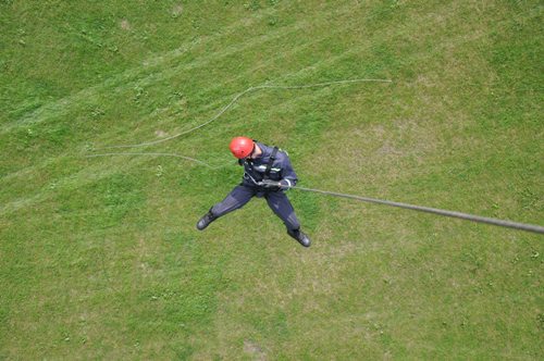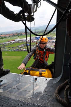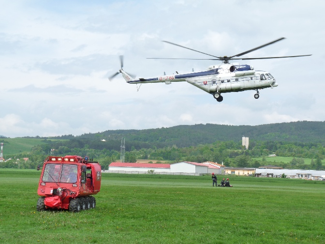 Hasiči z Trenčína predviedli dynamickú ukážku záchranných prác vo vzduchu pomocou vrtuľníka, kde sa 4 príslušníci Hasičského a záchranného zboru zlanili z vrtuľníka a následne ukázali prevoz zranenej osoby v podvese vrtuľníka MI - 171.