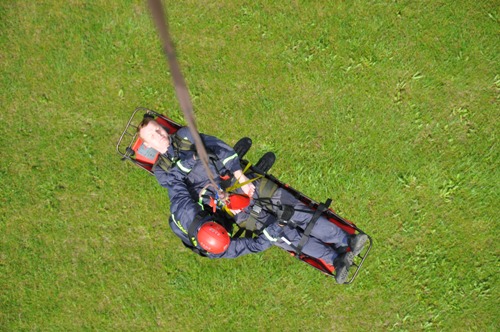 Hasiči z Prievidze v rámci svojich ukážok predviedli vyslobodenie a transport zranenej osoby z neprístupného miesta pomocou výškovej techniky - AR 39 MB Metz spolu s poskytnutím predlekárskej pomoci.