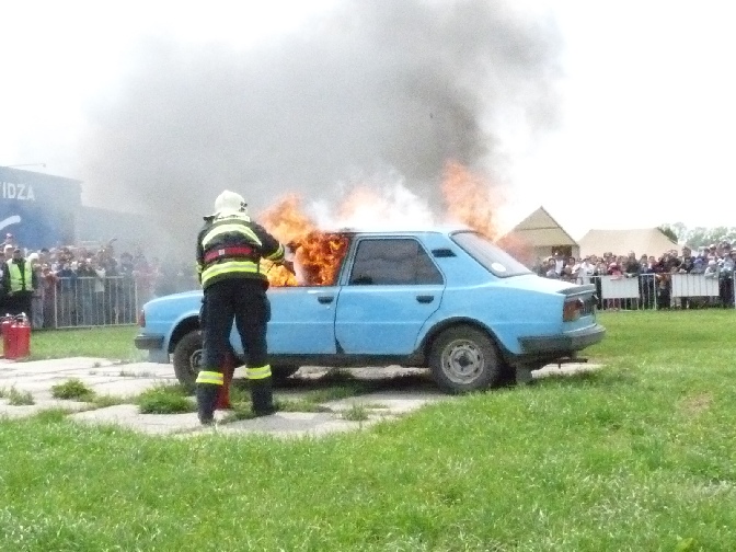 Taktiež predviedli ukážku hasiacich prác pomocou vysokotlakého zariadenia na horiacom vraku za pomoci ochranných oblekov OL 2.