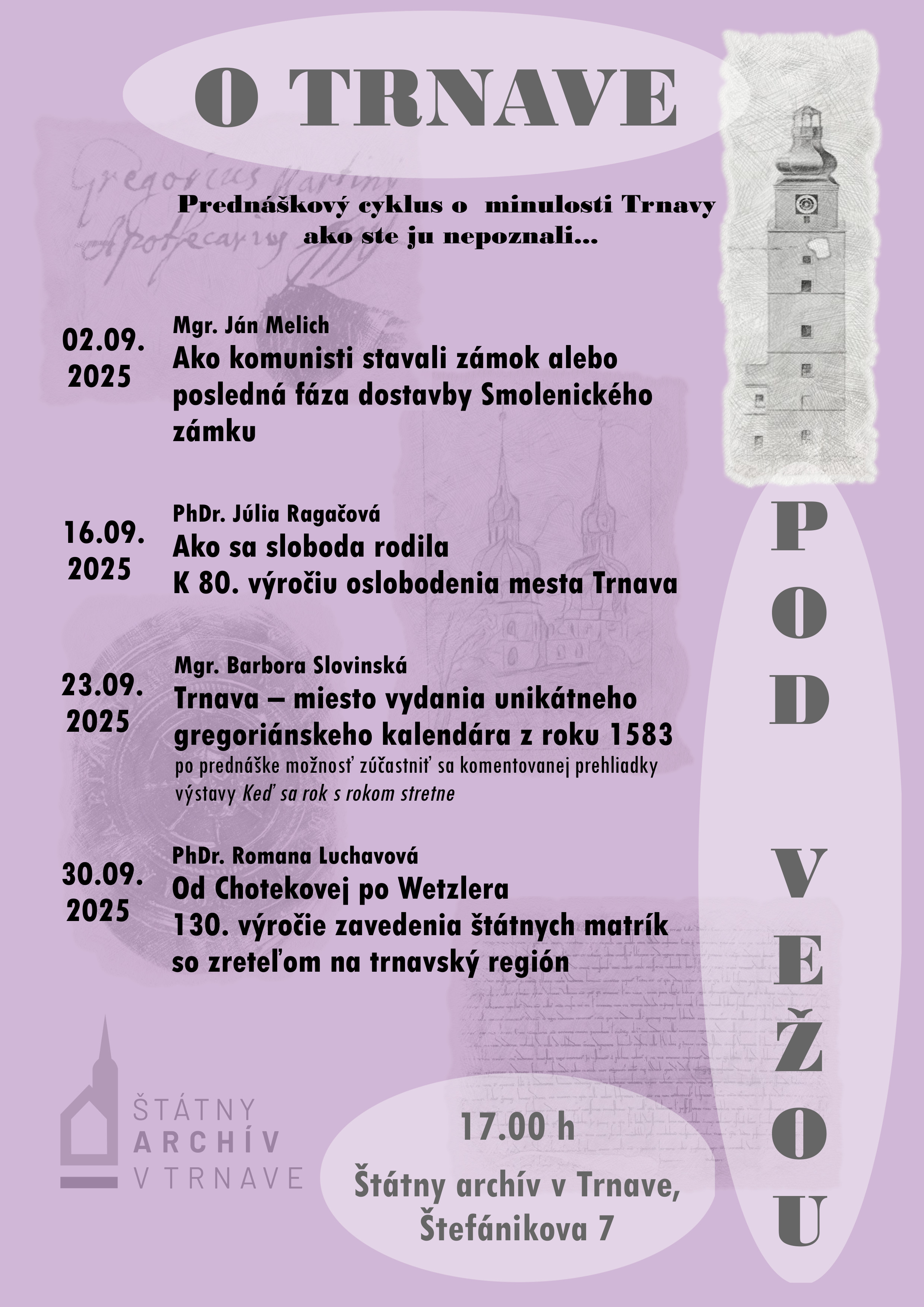 Počas dní 10. - 28. septembra 2020 sa v Štátnom archíve v Trnave uskutočnil cyklus prednášok O TRNAVE POD VEŽOU.